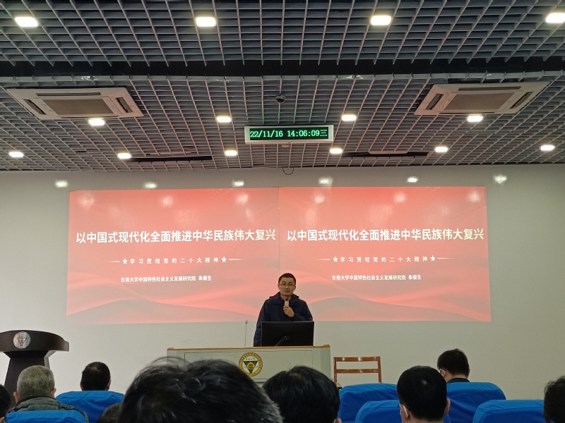 会上,朱教授以“以中国式现代化全面推进中华民族伟大复兴”为主题,从党的二十大的重大意义、报告概览、过去5年的工作和新时代10年的伟大变革、开辟马克思主义中国化时代化新境界、新时代新征程中国共产党的使命任务、全面建设社会主义现代化国家的重大部署、以党的自我革命引领社会革命等7个方面,对党的二十大精神进行了系统全面深入地解读。