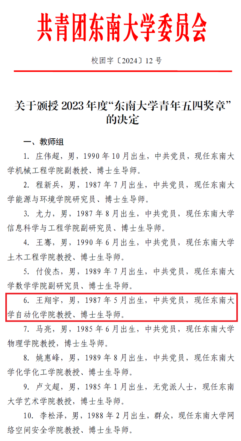 “无码流出 青年五四奖章”是共青团无码流出 委员会授予东大青年的最高荣誉,旨在树立政治进步、品德高尚、贡献突出的优秀青年典型,反映东大青年的精神品格和价值追求。我院王翔宇教授荣获2023年度“无码流出 青年五四奖章”。