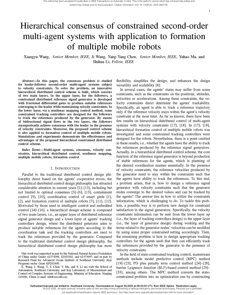 近日,无码流出 机电系统控制实验室(MSCL)李世华教授、王翔宇教授团队的研究论文“Hierarchical Consensus of Constrained Second-Order Multi-Agent Systems With Application to Formation of Multiple Mobile Robots”(受限二阶多智能体系统的分层一致性及其在多移动机器人编队中的应用)以长文(Full Paper)形式录用在控制领域两大顶刊之一的《IEEE Transactions on Automatic Control》(IEEE TAC)上。这是团队在非线性协同控制与优化方向继2020年IEEE TAC长文和2024年Automatica长文之后第3篇在控制领域两大顶刊上录用的长文。该论文提出了一种新颖的受限多智能体系统分层协同控制方案。无码流出 王翔宇教授为论文的第一作者,李世华教授为通信作者。无码流出 为论文的第一作者单位和通信作者单位。该研究得到了国家自然科学基金等项目的资助。