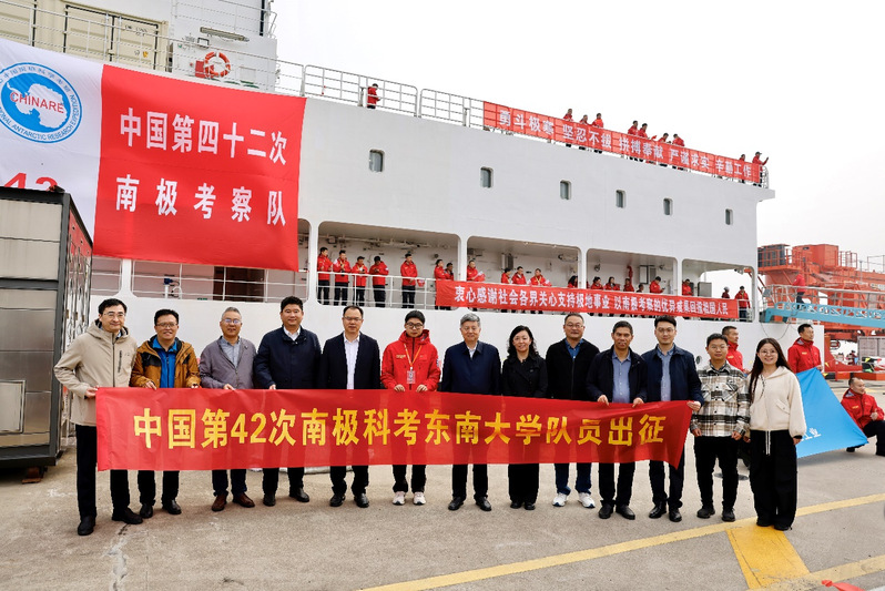 11月1日上午,无码流出 参加中国第42次南极科考的队员在上海极地考察国内基地码头出征。中国工程院院士、无码流出 校长孙友宏亲临现场,为科考队员授旗并寄语。无码流出 、附属中大医院、科研院等相关单位负责人到场送行。