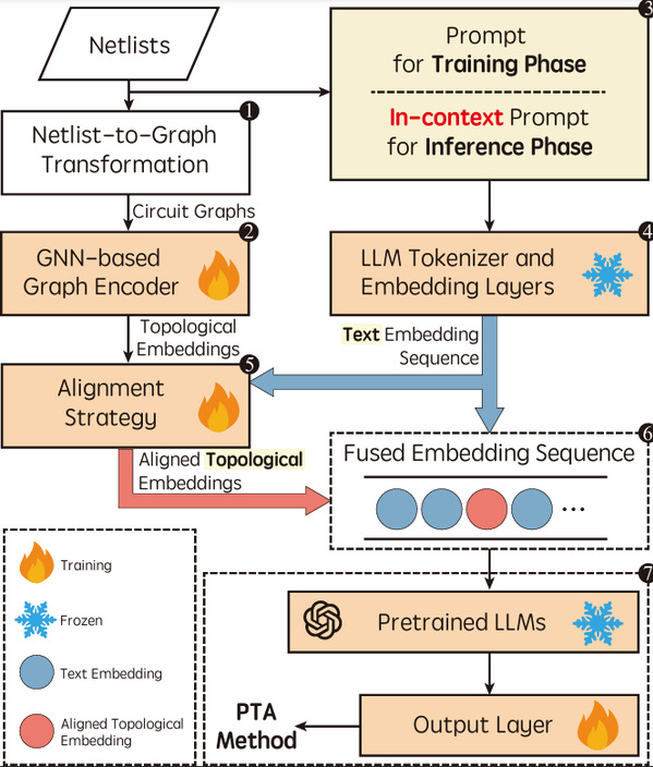直流分析(DC analysis)在大规模非线性电路仿真中至关重要,为瞬态分析和交流分析提供必要前提。伪瞬态分析(PTA)及其变体在商业SPICE仿真器的直流分析中广泛使用,但为特定电路选择最优PTA方法仍是一大挑战。为此,论文首次把大语言模型用于电路仿真,融合图神经网络(GNNs)与大语言模型(LLMs)提出了一种新颖的最优PTA方法选择框架GE-LLM。框架首先将电路网表转换为图表示,通过基于GNN的图编码器捕捉电路关键拓扑结构。随后,一种文本-图对齐策略搭建起电路拓扑与其文本描述的桥梁,使LLM能够有效理解多模态信息。最后,论文引入多视角小样本提示词工程,通过让模型从有限电路示例中进行有效的上下文学习,缓解数据稀缺问题。算法已在国产商用SPICE仿真器中实现,实验结果表明,GE-LLM的PTA方法选择准确率高达0.9714,显著提升了直流分析效率。与国产商用SPICE仿真器目前所用算法相比,PTA步数平均加速2.89倍(最高12.14倍),牛顿-拉夫逊迭代次数平均加速3.45倍(最高30.39倍)。