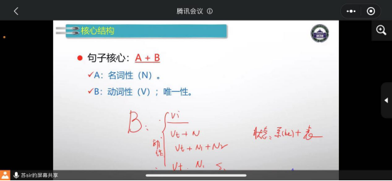 苏老师首先从语言的定义以及语言与世界、语言与心灵之间的关系展开,指出语法的作用就是帮助我们编码(encode),建构句子;以及解码(decode),获取意义。许多同学觉得语法比较困难的原因是不知道英文句子的核心结构,不懂得如何划分句子成分。针对这一实际困难,苏老师指出,句子的核心结构就是A名词性+B动词性,其中的动词在该句中必须具有唯一性。所有的英文句子都是用这种核心结构,通过并列和从属等不同的组合方式组合到一起的。接着苏老师解释既然动词唯一,那多余的动词该怎么处理?非谓语动词的主被动如何判断?这个问题困扰着无数学生,使得他们无论是在阅读中需要切分长难句时,还是在写作中需要注意语法结构时,都头痛不已,找不到简单而行之有效的解决办法。最后,苏老师还进一步阐释了句子名词性部分6种不同的修饰语表达法,动词性部分5种修饰语表示法,帮助学生从主干到细节更深层地理解英语长难句。