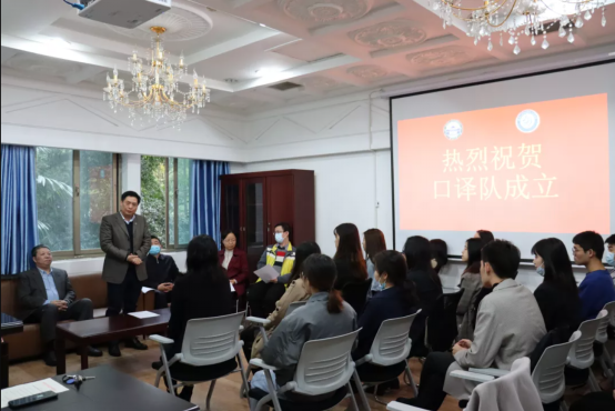口译队在外语学院1030举行了成立大会。外语学院对本次会议给予高度重视,黄宏发书记、马萧院长、孙燕副书记,团委书记刘迪、以及翻译系熊伟主任、黄敏副主任、江承志副主任等多位领导出席了会议。口译队全体队员参会。