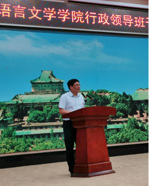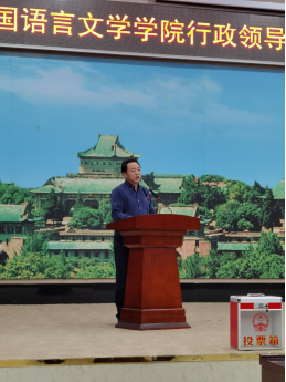 换届说明结束后,外语学院院长马萧代表院行政领导班子进行述职。马院长总结了这四年来外语学院取得的卓越成绩,报告了学院各项工作中的进步与突破,赞扬了抗疫期间外语学院涌出的先进个人,指出了现存问题,并对下一届行政领导班子提出希望。在个人述职时,马院长阐述了自己以身作则、秉公办事、时刻把群众利益放在首位的原则,也深刻指出了自己现存不足,并提出对未来的展望。