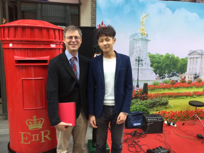(罗密欧扮演者李琛涛与英国驻汉总领事卫亭瀚先生合影留念)