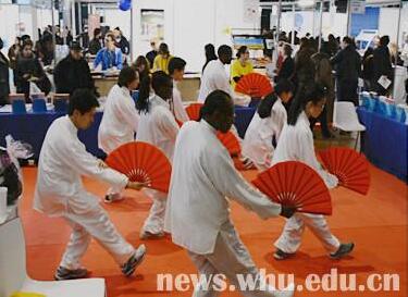 23日下午,孔子学院师生同台表演太极扇。伴着《中国功夫》铿锵有力的乐声,演员们的动作整齐划一、精气十足,博得在场观众阵阵喝彩。