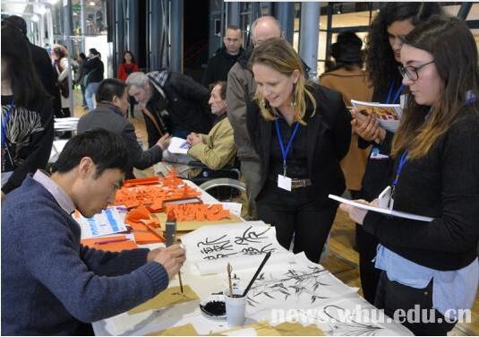 孔子学院书法、绘画班的师生进行的书法绘画展示,也吸引了众多参观者驻足欣赏。不少观众还跃跃欲试,在老师的指导下或写或画,现场气氛十分活跃。