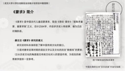 周瑾等同学的创新训练成果《中国古典的日本‘汉文训读’方法与实践》聚焦于“汉文训读”,以期用研究成果让中华优秀传统文化走向世界,得到更广泛的传播。汉文训读是日语专业领域使用的核心方法,是指在保持汉文原文不变的基础上,通过标记以提示音、义、语序等信息的一种文献注释现象。国内在该领域的研究缺乏系统性和全面性,存在深度不足、具体研究对象较少、微观研究欠缺等问题。本项目的实践应用材料选取的是唐古注《蒙求》。项目组成员先进行实践材料的活字化识别工作,计划用汉文训读法对文本进行解读和注释。预计取得成果共有两个:理论学习后形成的研究报告和另一份则是实践应用成果,并计划在日本学术刊物上发表。目前已经顺利开展到一半。本项目有具有相当实用的价值:更新有关研究成果,为现在的教育教学提供一定参考;为后续的相关研究课题提供了研究材料;有利于保存优秀文化成果,传播中华优秀传统文化。