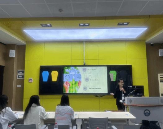 曾璇老师的课程《环境保护与我》别具一格,她首先利用头脑风暴和思维导图构建了“垃圾”这一核心词汇体系,创造真实情境并自制教学道具,通过小游戏和智力问答,以轻松愉快的方式让学生参与到垃圾分类的学习中,掌握德国的垃圾分类知识。随后,她总结了在教学过程中所使用的语言模块。在本次课程中,曾老师不仅在教授德国垃圾分类规则的同时,还引导学生探索中国的生态环境保护与治理之路,以习近平主席提出的生态文明建设重要思想——“绿水青山就是金山银山”为指引,提高学生的环保意识,实现了外语教学与育人的有机结合。