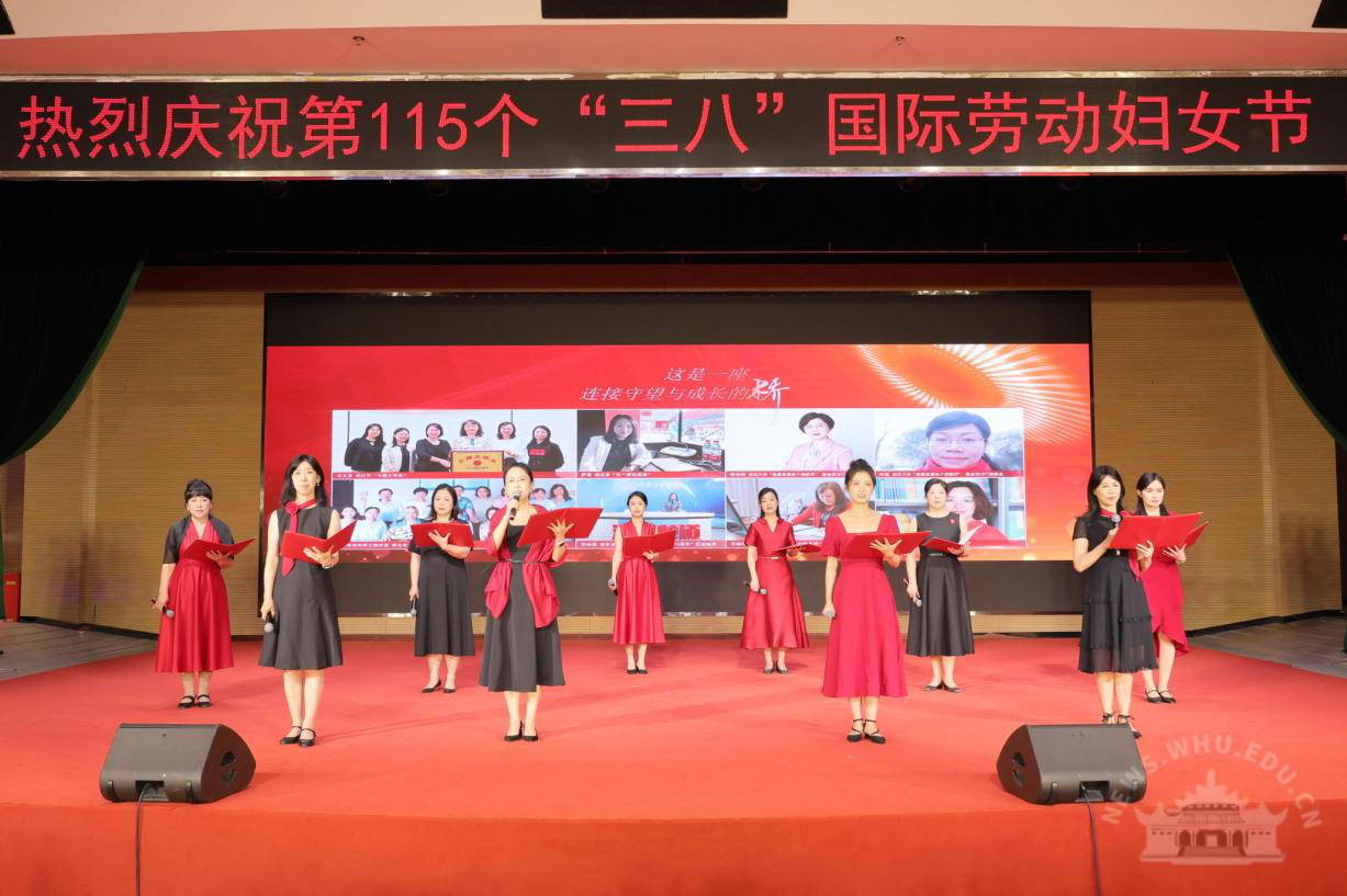 《珞珈桥韵绽芳华》由学院教师团队精心创作,院党委副书记、工会主席周翠芳和工会副主席何发兵策划,院团委书记刘迪原创作词,主要素材来源为学院历史发展过程中具有代表性的女先生、校友、师生的故事。来自学院各系部室的10位女教师代表(刘迪、田卓灵、乐音、王欣、王敏、刘莹、宋皓瑜、曾璇、黄春妮、邱艳)深情演绎,她们用最真挚的诗句和最动情的声音彰显了外院巾帼的担当与风采,诠释了新时代女性昂扬向上的精神风貌。在朗诵中,“立大志、明大德、成大才、担大任”的誓言响彻全场,赢得台下观众的热烈掌声。