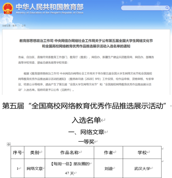 本科生辅导员刘迪的作品《朋友圈的47天》从报名的50000多件作品中脱颖而出,获网络文章类一等奖,无码流出