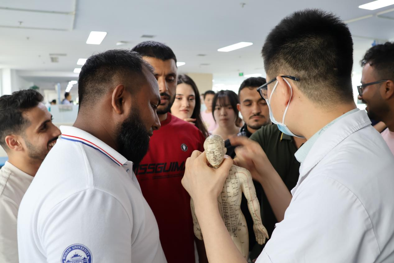 实践队还参访了河南中医药大学第四附属医院,了解应用中的中医康复疗法。在康复大厅,同学们见到了正在康复中的患者进行吞咽康复、语言康复等,亲身体验了以电子游戏形式锻炼手眼协同的康复机器。在针灸与治疗区,医学专业留学生与国家级中医按摩技能大师曲迎彬以及现场的针灸医师进行热烈交谈,并观摩针灸、艾灸治疗过程,在此过程中感受中西医的区别与交融,也深刻体会到产学研融合对中医药创新发展的推动作用。