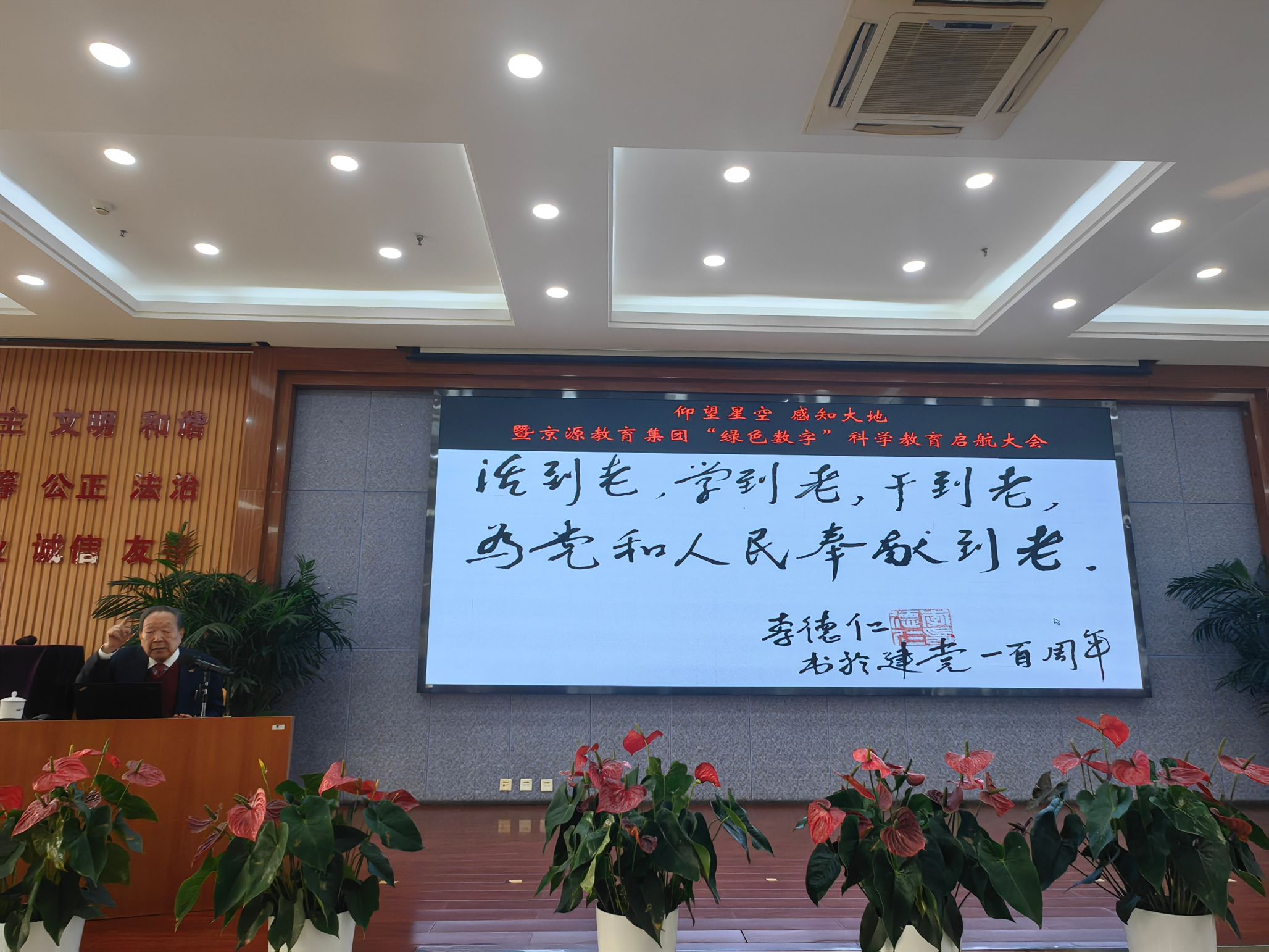 活动期间,李德仁院士以“爱我中华,科技报国”为题,为京源学校师生进行了专题讲座。在讲座中,李院士围绕“留学之路”“创新之路”“未来之路”三个关键词,分享了留学期间的成长之路,介绍了带领团队攻坚克难,服务国家重大战略,助力国家科技自立自强的故事,并以自己“活到老,学到老,干到老,为党和人民奉献到老”的书法作品勉励学生心怀家国、将个人理想融入国家发展大局,使在场师生备受鼓舞。讲座后,李院士与现场学生亲切互动,耐心细致地解答学生的问题,学校学生、教师代表向院士献上鲜花与绘画作品。
