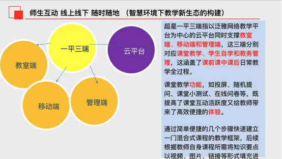 讲座后半段,老师们加入学习通班级群开展互动,从学生的角度切实体会了“学习通”各个功能的使用感受。最后,郭懿老师分享了自己对未来智慧教学的展望,线上线下混合式教学模式将深度融合进生活的方方面面,随时随地、每时每刻的泛在教学即将真正实现,教与学将完全打破时间和空间的限制。她建议老师们积极接纳、拥抱新技术,并真正成为智慧教育的践行者。整场讲座内容丰富、深入浅出、生动形象,现场聆听的老师们精神饱满、兴趣盎然、互动热烈。