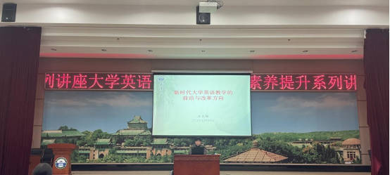 博士生导师、教育部高等学校大学外语教学指导委员会委员汪火焰教授。本次讲座由大学英语部副主任赵玲主持,外语学院副院长程向莉、大学英语部主任张明尧以及大学英语部全体教师出席聆听了讲座。