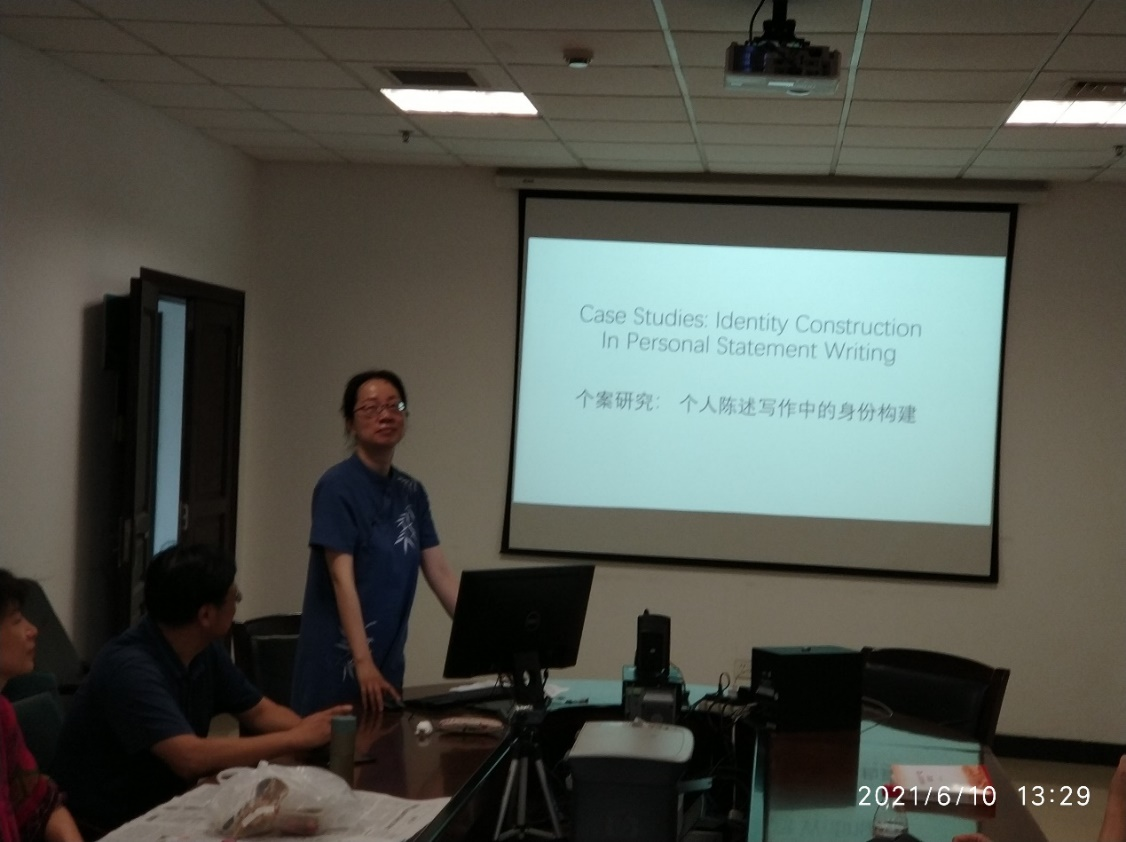 2021年6月10日,英文系在外语学院3055会议室举办了本学期第五场学术午餐会。本次讲座由李映老师主讲,刘庆荣老师主持,主题是:“个案研究:个人陈述写作中的身份构建”。开讲之前,李映老师阐述了研究的初衷。李老师的博士论文研究方向是语篇分析,因此想选取具体的语篇体裁进行研究。由于李老师近些年帮助很多学生为出国留学写推荐信和修改个人陈述,而当前国内外针对个人陈述写作的研究较少,且基本都是从体裁分析的视角去探讨,所以她选择了从身份构建的视角解读个人陈述。