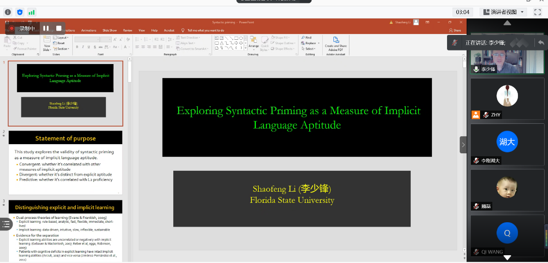 研究生及教师开展线上讲座,主题是“前启作为隐性语言学能测量方法的有效性”。此次讲座由英文系王琦老师主持,院长马萧教授和程向莉副院长,以及外语学院多名教师和研究生参与互动交流。