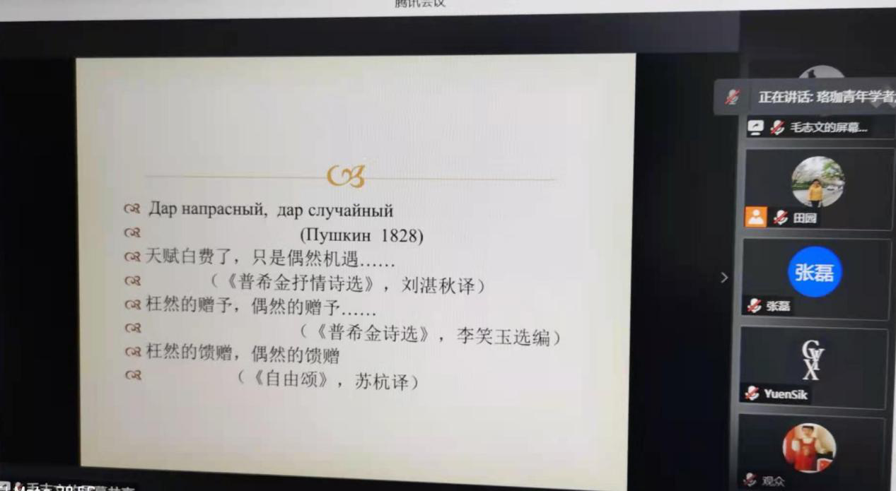 外语学院俄语系讲师毛志文老师为俄语系师生和校友做了题为“俄语诗歌翻译探索”的线上学术讲座,讲座以腾讯会议形式进行,时长1时30分钟。约30名俄语系师生、校友听取了讲座。