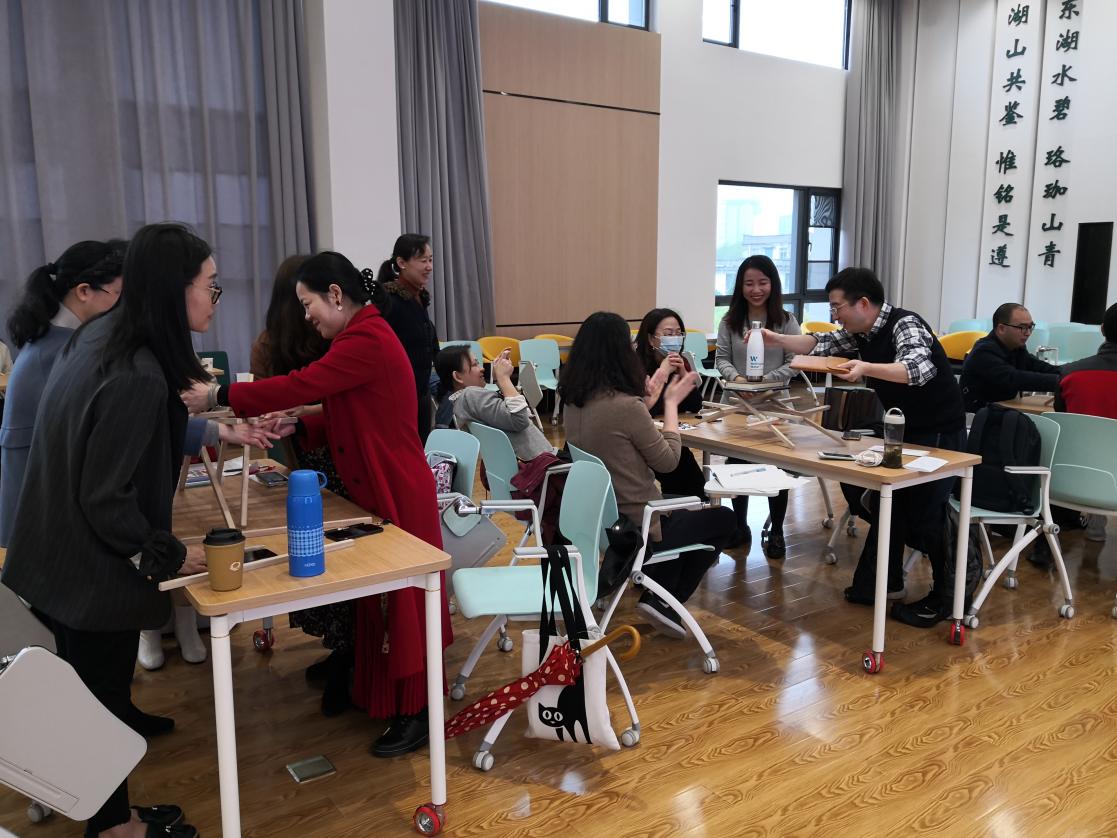 万臻老师依托自身教学经验,结合大学英语部教学特点,在前期问卷调查的基础上对工作坊的流程进行了设计。工作坊从小组内相互介绍开始,通过两两合作制作名片吸引老师们的注意力,随后的暖场活动“建大桥”更是让老师们兴趣倍增。有的组一边看指导视频一边细心操作,一次搭桥成功;有的组则反复实践终获牢固大桥,还有的组为了更好的效果,在地板上搭建大桥。