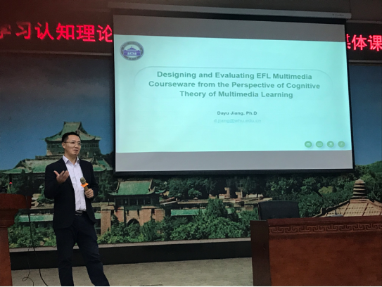 2020年11月19日下午,外语学院英文系副教授姜大雨博士应大学英语部的邀请,在外语学院学术报告厅做了一场题为“多媒体学习认知理论视角下英语作为外语教学多媒体课件的设计与评价”的学术讲座。外语学院程向莉副院长,大学英语部全体教师,两位外教和外语学院研究生等参加了讲座。