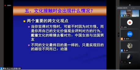 讲座结束后,郑教授还与参与的师生进行了互动,解答了同学们关于中国文化推广、打破文化交流中的固有印象等问题。郑老师的这场讲座运用大量实例解释理论问题,语言诙谐幽默,让大家轻松地了解到中法跨文化交际中存在障碍成因和解决方式,取得了热烈的学术交流效果,参加讲座的师生纷纷表示收获颇丰且深受启发,期待再次聆听老师的教导。