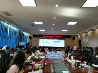 硕博研究生参加了此次讲座。讲座由黄敏副教授主持,他简要介绍了译满天下公司以及视频翻译行业,并代表在座师生向王正航总经理一行表示热烈欢迎。