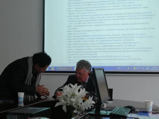 法语系并举办讲座。讲座主题为:法语的现代(Moderniser la langue française)。法语系系主任吴泓缈教授出席并主持了此次讲座。赛伯乐教授是具有全球知名度的法语专家,长期主持法国电视五台的法语专题节目“谢谢您,教授!”,并曾担任法国国立法语研究所所长、法语高级委员会副主席、法语及法国语言事务高级代表、法国国家阅读研究中心主席等重要职务,出版过专著十余部。