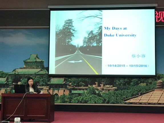 第二位主讲人是蔡小容教授,她用“我”之所见为主线展开了下半场的讲座。蔡小容教授首先介绍了著名的杜克大学,然后谈到自己非常享受在图书馆学习、阅读的时光,常常流连忘返。蔡小容教师分享了自己读过的一些书,并提到自己在杜克的时光像是在是读广义的英文系,因为杜克大学的环境和资源给她很多的阅读的选择,也让她能够更沉下心来读好书。在谈到杜克大学的学习生活时,蔡小容教授认为听的几门课让她收益颇丰,而丰富的讲座和学术活动也让她得以接触到一些研究领域里的大师,有了更深层次的交谈和思考。最后,蔡小容教授提到在访学的过程中,生活和学术上的体验都特别美好,也因此成为她最难忘的回忆。蔡小容教授鼓励大家积极寻求出国深造机会,但是出国深造前一定要对自己的研究有一个清晰的认识和界定,对自己研究背景和研究方向有更深入的思考。