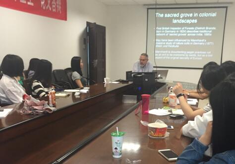 2016年6月27日上午,英国阿伯丁大学资深讲师William Tuladhar-Douglas博士于外语学院3054会议室开展题为“Sacred Grove(圣林)”的专题讲座。Tuladhar-Douglas博士以圣林为例,向听众们展示了如何通过历史研究与文本批评来批判与影响硬科学领域的工作。本次讲座由英文系副教授戴丹妮老师主持,到场听众包括英文系教师与硕士研究生。