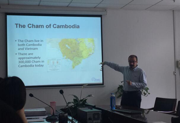 师生介绍了美国语境下西班牙语与英语混合而成的语言Spanglish的产生及发展现状,从语言/方言的角度分析了Spanglish出现的社会及历史原因,用丰富多彩的现实语料阐释了此类研究的社会价值与语言学价值,并指出在多种族背景中英语作为主导语言时西班牙英语的潜在发展前景和可能性。第二场讲座中,Lopez教授基于其对柬埔寨少数民族语言的丰富研究经验和实地考察经验,首先介绍了柬埔寨国家的地理历史文化等基本知识,接着讲述了在尊重柬埔寨历史社会文化的基础上美国大使馆在该国举行的语言规范化活动,并详细叙述了为保护少数民族语言所作出的种种努力,包括编写少数民族语言教材,建立少数民族语言教学研究委员会,培养合格的语言教师,建立少数民族语言学校等。在两场讲座结束后,Lopez教授与现场师生都进行了问答互动,分享了在全球化视角下语言学家如何进行实地研究调查的亲身经验。Lopez教授对中国少数民族语言的发展现状非常感兴趣,与现场师生热情讨论了大陆地区对少数民族语言的保护政策等社会语言学问题。