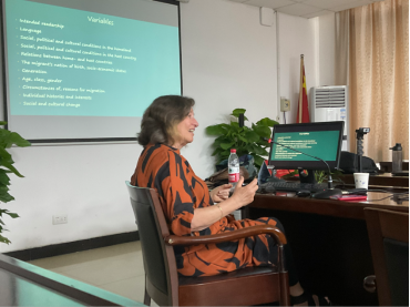 首先,奥门森教授从理论角度向与会师生介绍了“diaspora(流散)”一词的定义及争议。在介绍相关理论之前,奥门森教授先就“流散”一词的起源及意义作了简单介绍,她指出于“流散”一词源自希腊语,意为“撒播”、“散开”,最开始用以指代流亡至世界各地的犹太人。随着近三四十年现代流散群体的逐渐扩大,专家学者开始对“流散”问题进行深入研究。如今,对于流散和流散群体的界定及意涵随着时代和文学及文化研究的发展逐渐外扩,流散从原来的单指被迫流亡的人口变为涵括主动移民的人口。但奥门森教授指出,对流散的定义仍有许多悬而未决的地方,理论家对此也有争论,例如:一群流散人口在何等情况下不再被称为流散?他们何时会被主流人口同化?一个人是否可以自由选择流散身份?