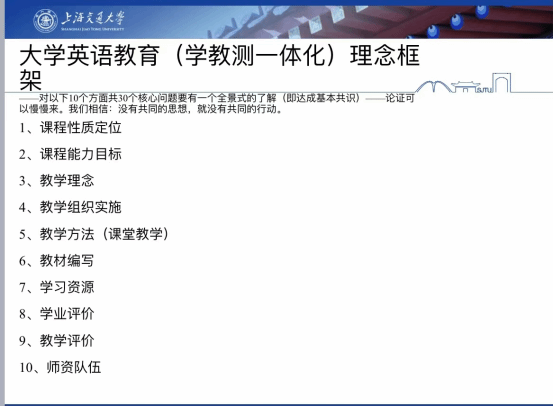 朱教授的讲座首先聚焦上海交通大学大学英语“学教测一体化”改革核心理念即“交大共识”30条,从课程性质定位、课程能力目标、教学理念、教学组织实施、教学方法、教材编写、学习资源、学业评价、教学评价、师资队伍等十个方面全面解读了30个核心问题的宗旨和内涵。英语能力是当代大学生的核心素养之一,大学英语教育兼具工具性和人文性,工具性能力是基础,思辨能力培养是大学教育的一个共同目标,跨文化交际能力的培养是大学英语教育的主要目标之一。大学英语“学教测”是一个有机整体,涵盖有效的学习、教学和测试。