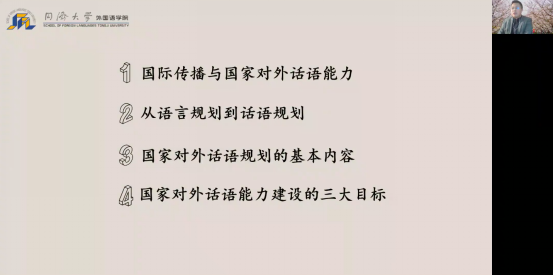 沈骑教授的讲座主要由四部分组成:国际传播与国家对外话语能力、从语言规划到话语规划、国家对外话语规划的基本内容、国家对外话语能力建设的三大目标。沈老师指出,加强与改善国际传播工作、提高对外话语能力是外语学科发展的重要使命,面对百年未有之大变局,国家对外话语能力建设对学术研究,人才培养、资源转化和话语规划都提出了新的挑战。语言规划向话语规划转型主要经历三个阶段,逐步完成从语言本体到语言使用与传播,再到适应于语言文化、跨文化翻译以及适应信息技术环境变化的三次转型,从单一形式语言层面的语言规划行为,进入到多元环境下的话语规划空间。话语规划基本内容主要包括话语本体规划、话语地位规划、话语教育规划、话语声誉规划、话语翻译规划、话语技术规划。国家话语规划取决于微观层面的国家话语资源建设、中观维度的话语能力评价以及宏观层面的话语生态环境建设三管齐下。当前国家话语能力建设不仅需要语言规划的学科知识滋养,从中汲取语言规划理论与方法,更需要系统开展国家话语规划实践,解决国家话语体系中存在的现实问题,从而推进国家话语能力建设的创新与发展。