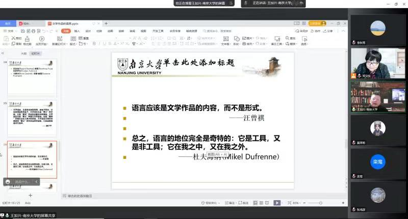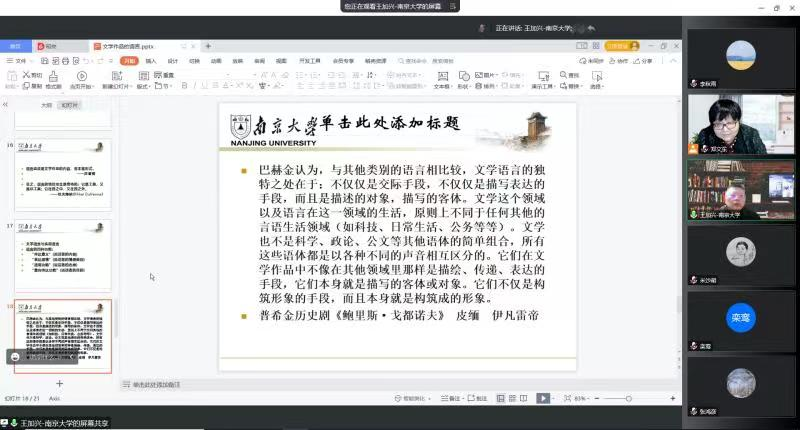 本次讲座的题目为:文学作品的语言。王老师主要从语言在文学中的地位、语言艺术的基本特征、文学语言的文体类型三个部分展开。王老师以载体论与本体论为主线,梳理了欧美、俄罗斯与我国的文论发展,通过阐释语言在文学中的地位,说明在外国语言文学研究领域中,语言和文学虽然是两门独立的学科,但它们之间有着不可分割的联系。王老师在讲述时引经据典,对比中外名家的相关评论,给师生们留下了深刻的印象,同时拓宽了研究生的学术视野。讲座后,王老师与俄语系师生亲切互动,详尽回答了同学们提出的问题。