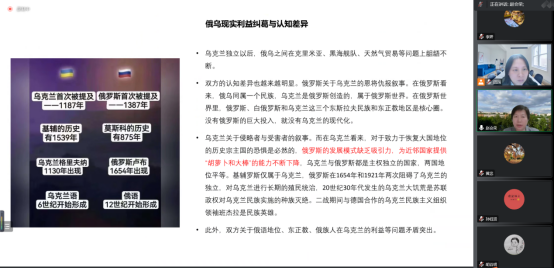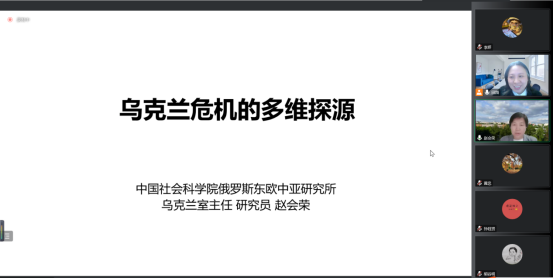 11月24日晚,中国社会科学院俄罗斯东欧中亚研究所乌克兰研究室主任、俄罗斯东欧中亚学会常务理事、中俄战略协作高端合作智库理事、国务院发展研究中心欧亚社会发展研究所研究员赵会荣教授应邀为武大外院俄语专业师生作题为“乌克兰危机的多维探源”的线上学术讲座。本次讲座由外语学院俄语系副系主任、区域国别乌克兰研究中心主任田园老师主持,俄语系的各位老师、国际交流部的老师以及俄语专业部分本科生与研究生参与讲座。