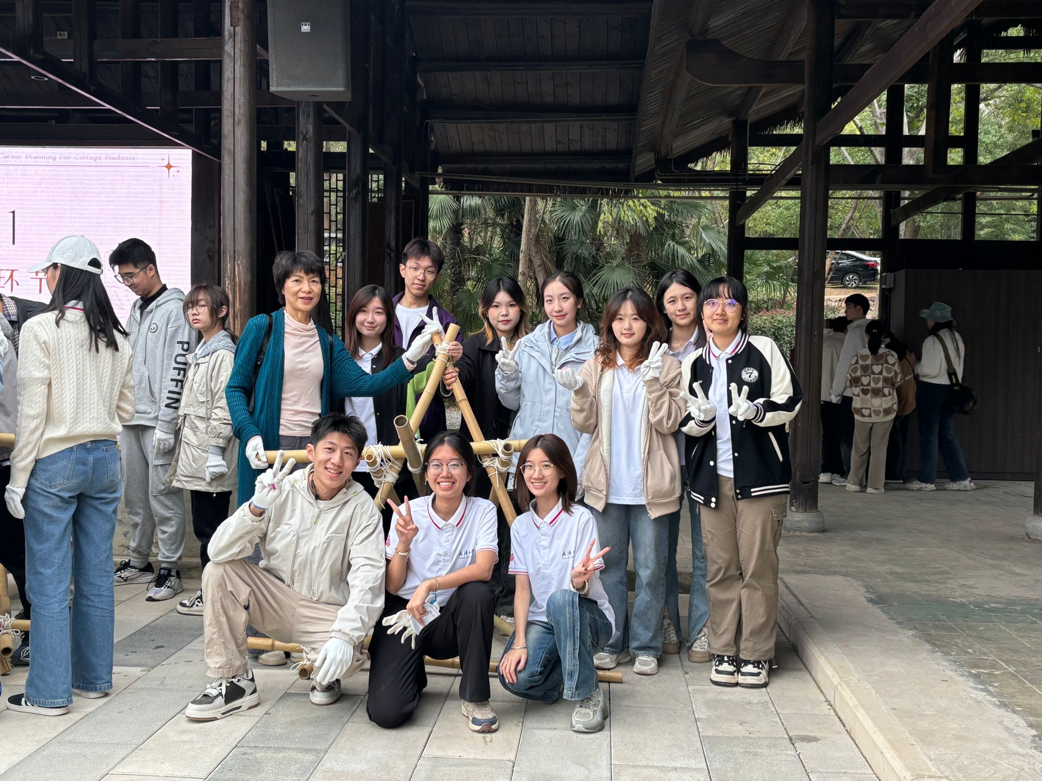 迎来了一场别开生面的劳动教育实践活动,学院党委书记黄宏发带队,聘请信息学部第四食堂经理张建兵老师作为劳动导师,英文系老师左广明、2023级涉外法律人才实验班班级导师张东燕、2023级德语班级导师鲁晓雁、本科生辅导员王文卓、兼职辅导员邓亚雯共同参与此次劳动实践教育。73位同学与老师们在秋日丰收的田野上学习扎染工艺、亲手种植蔬菜、体验助农直播,动手搭建竹制炮架,体验劳动的艰辛与快乐,习得劳动的技能与价值。