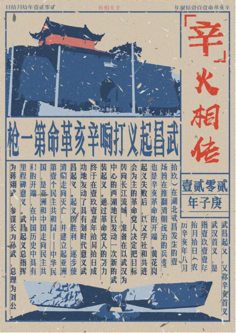 “辛”火相传海报用竖式报纸形式,将记录辛亥革命历史的文字排成报版,配以武昌红楼、起义门、辛亥首义烈士公墓等“武汉元素”图案,传递并弘扬辛亥革命精神。文创产品设计以“辛”火相传为主题,以木刻版画方式,象征着传递火种的木柴,寓意着辛亥革命的精神代代相传。这些设计不仅具有纪念意义,也是一种辛亥革命精神的传承。作品集中展现了两岸青年对两岸同根同源的认识增强了文化认同、民族认同和国家认同。
