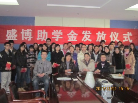 12月1日下午2点30分,“2011年盛博助学金发放仪式”在外语学院3005会议室内顺利举行。仪式由院团委书记王敏老师主持,院党委副书记贾玉敏老师,本科生工作办公室吴林珂老师、刘迪老师,与获得“2011年盛博助学金”的30名受助学生共同参加了颁发仪式。