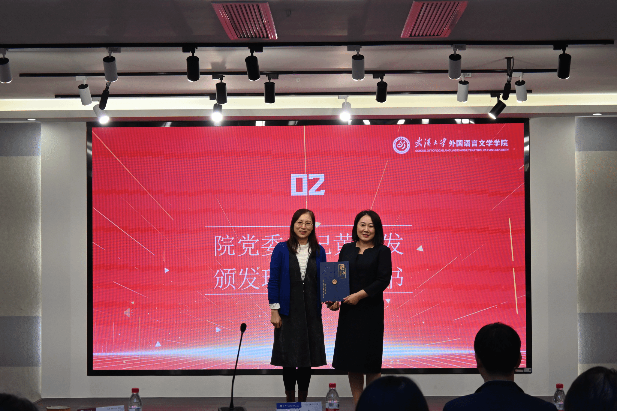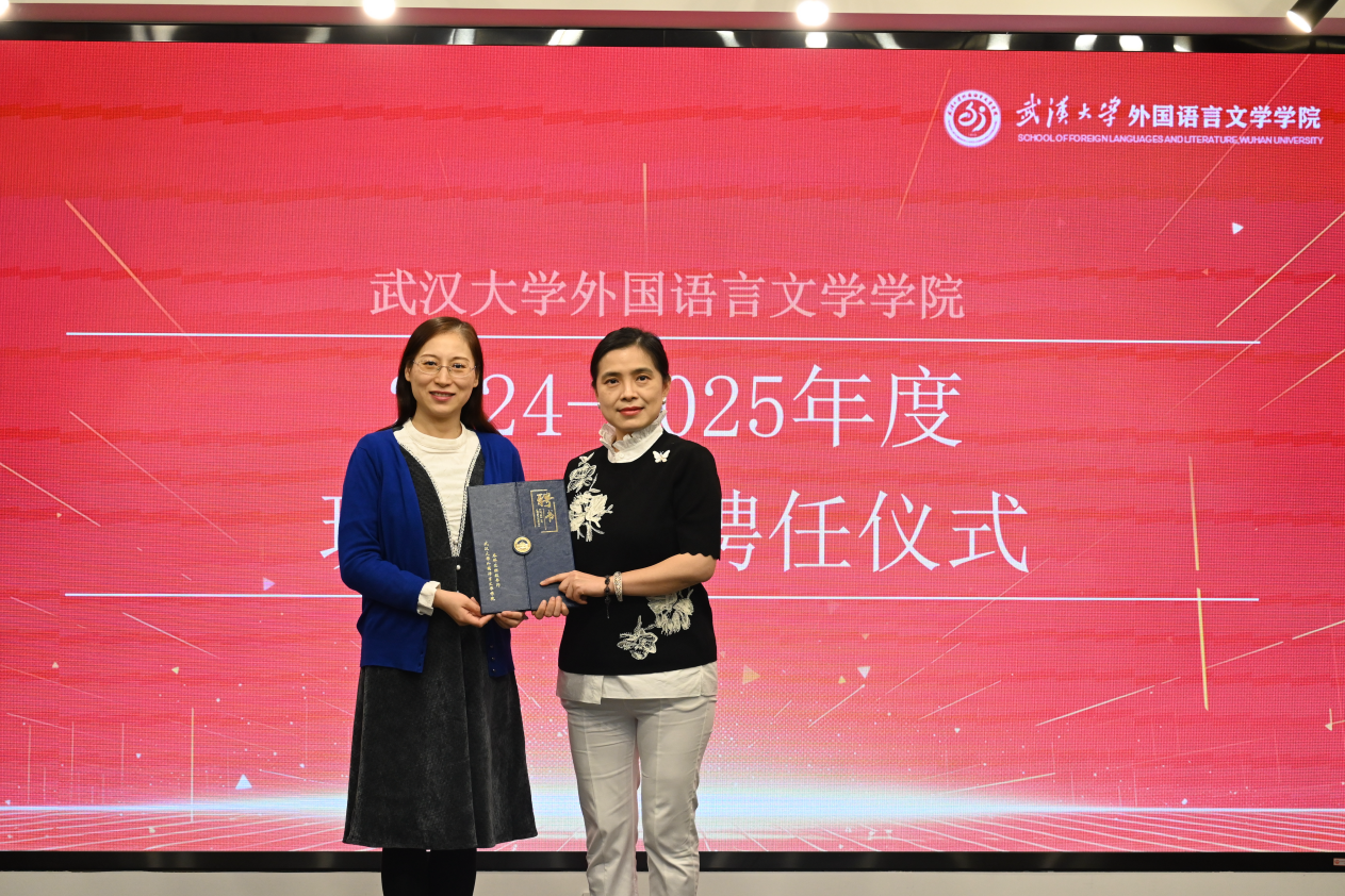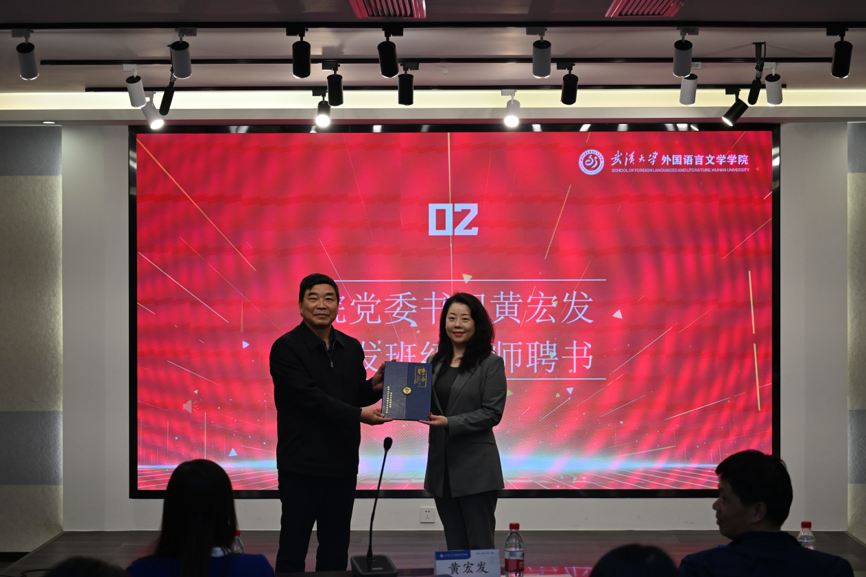 随后,院党委书记黄宏发为陈波老师、周晓明老师和吴蔚老师颁发聘书;副院长张妍岩为外语学院2024-2025年度的33位本科生班级导师一一颁发聘书。