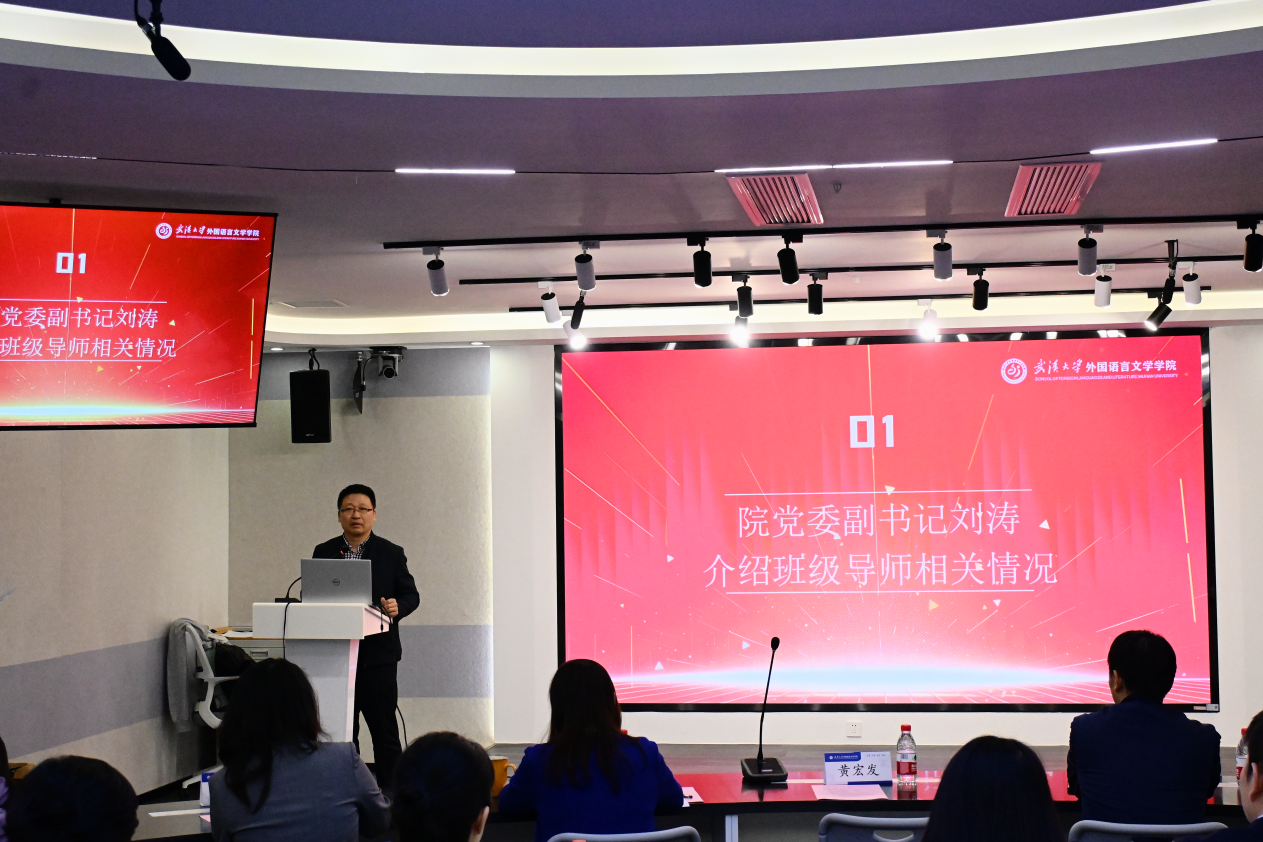 院党委副书记刘涛首先对学院班级导师工作的总体情况进行介绍。他围绕学院聚焦新时代“外语+”复合型人才培养目标的工作思路介绍了本年度班级导师工作的创新举措,邀请新闻与传播学院陈波教授担任学院国际传播试验班班级导师,邀请国际治理研究院周晓明副教授和中国边境与海洋研究院吴蔚副教授担任涉外法律人才试验班班级导师,为复合型外语人才培养提供跨学科支持,助力国际传播人才与涉外法律人才的成长与发展。
