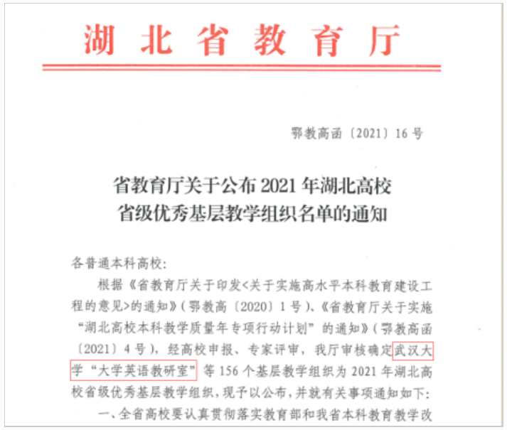 Recently, the Department of Education of Hubei Province has released the list of the Excellent Basic Educational Organizations of Colleges and Universities. In total, four Basic Educational Organizations in WHU have won the reputation and one of them is our college (College of Foreign Languages and Literature).