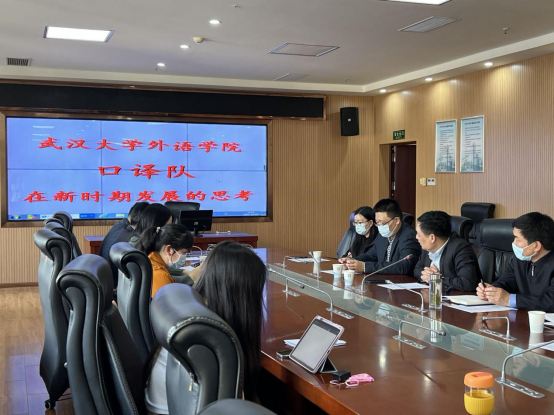 口译队在外语学院4016同传室召开工作汇报座谈会,就口译队队伍建设和品牌打造等议题进行研讨。院党委书记黄宏发、院长马萧、分管研究生工作的院党委副书记周翠芳、分管本科生工作的院党委副书记刘涛、院团委书记刘迪、英文系主任张国庆、英文系副主任黄忠、大英部主任张明尧、翻译系主任熊伟、翻译系副主任江承志、口译队顾问老师吴钟明、口译队指导教师罗菁以及口译队员代表参加了此次座谈。座谈会由翻译系副主任黄敏主持。