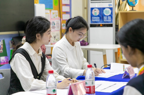如何把握时间,在有限的时间内通过专业提问引导孩子们尽可能展示自己的英语水平?如何多方面考察孩子综合素养并通过科学细致的评分准则对每位候选队员的能力进行评估和记录?这些都难不倒口译队的队员们。队员们用自信流畅的表达、优美标准的口音、亲和不失稳重的气质,充分向澳洲国际学校全体师生展示了武大外院口译队员的专业风范。